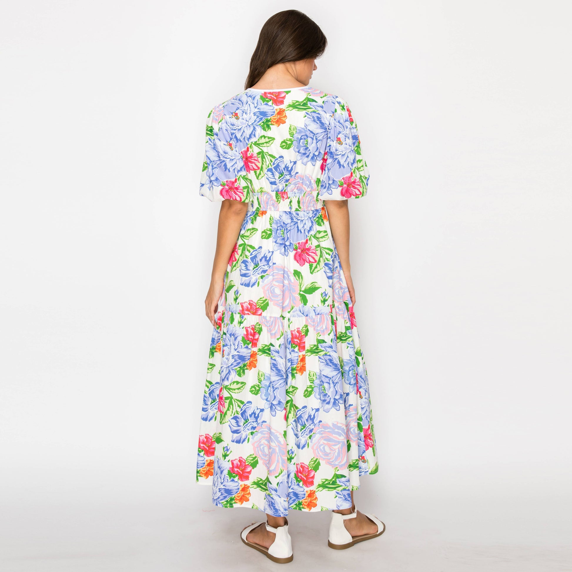 Summer bright flower print cotton midi dress - White color binding on neckline and bow tie - Double elastic on waist - Bubble sleeves - Full lining - C.F. LENGTH - 48" SELF - 100% COTTON LINING - 100% COTTON