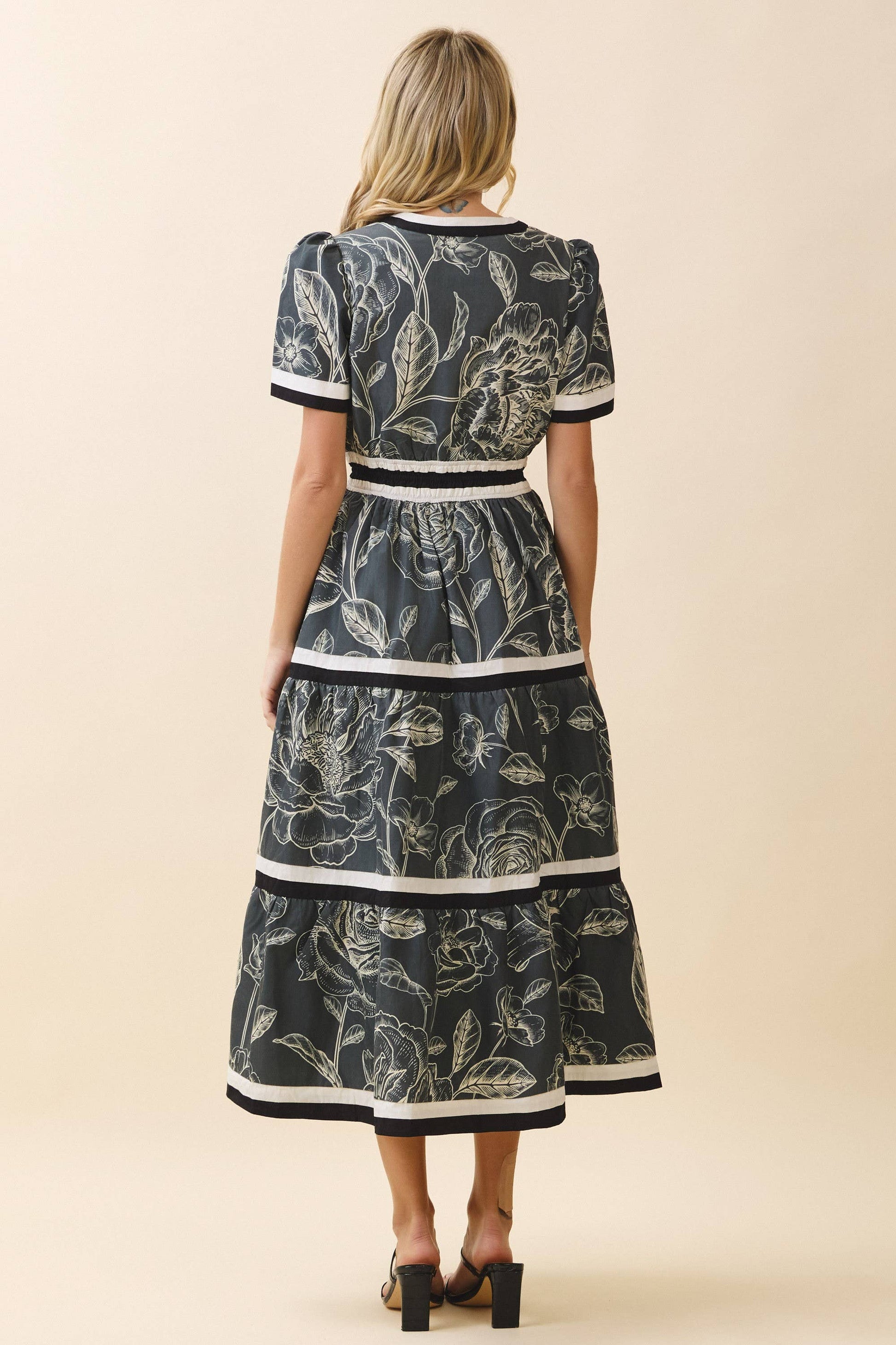 A floral-print midi dress featuring a round neckline with a front slit, short puff sleeves, and a tiered skirt. Designed with contrast white and black trim throughout, an elastic waistband for comfort, and side pockets for practicality.