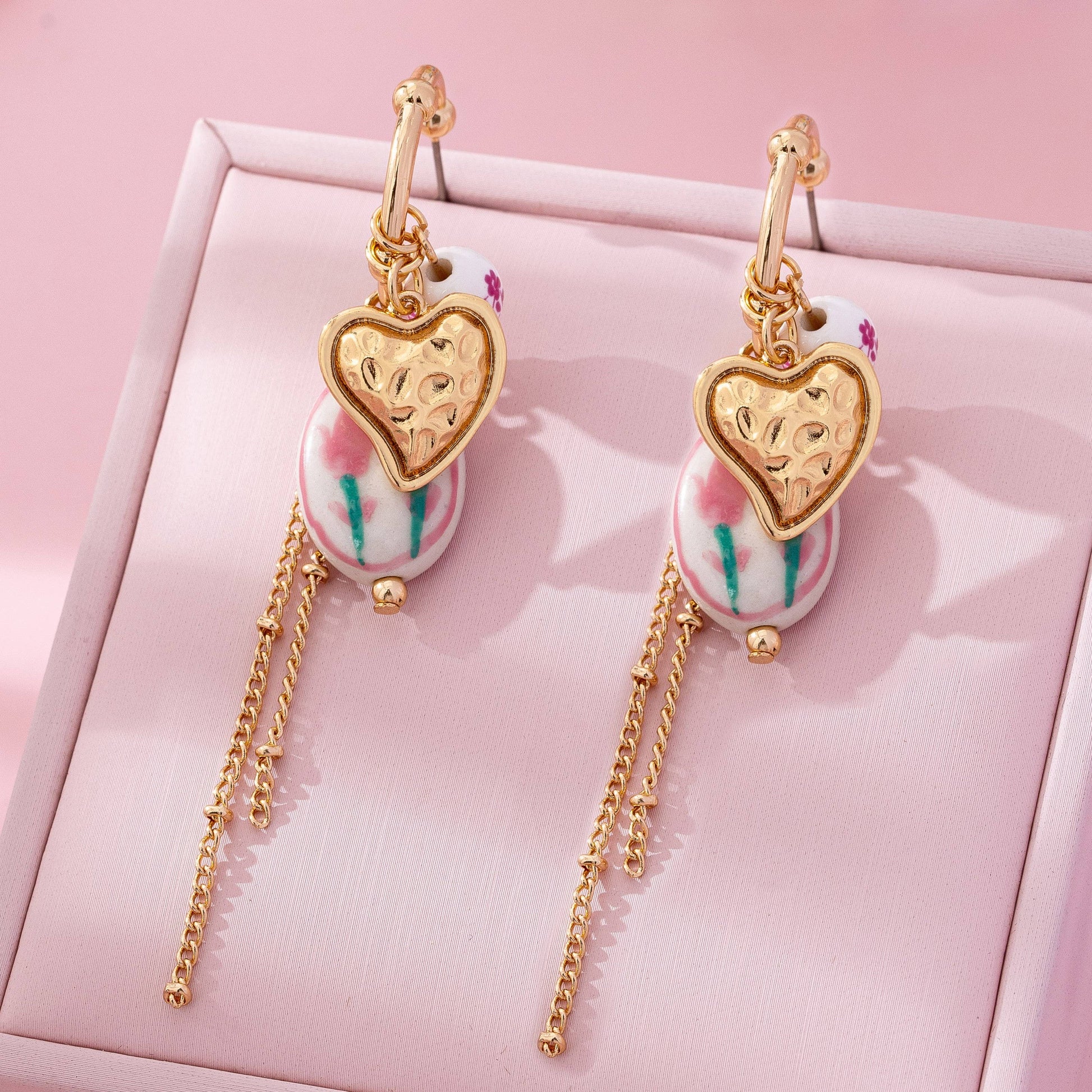 Feature gold-tone mini hoops are loaded with eclectic dangling charms: hammered heart pendants, oval porcelain beads hand-painted with delicate pink tulips, tiny white floral rounds, and swaying gold chains for movement. Romantic and whimsical, they add vintage-inspired charm