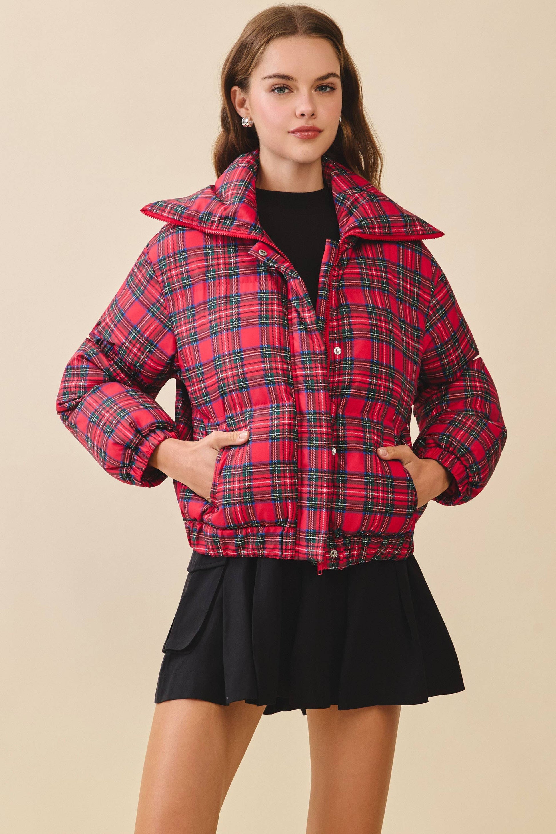A plaid puffer jacket featuring a high stand collar, long sleeves with elastic cuffs, and a front snap-button and zipper closure. Designed with an elastic hem.