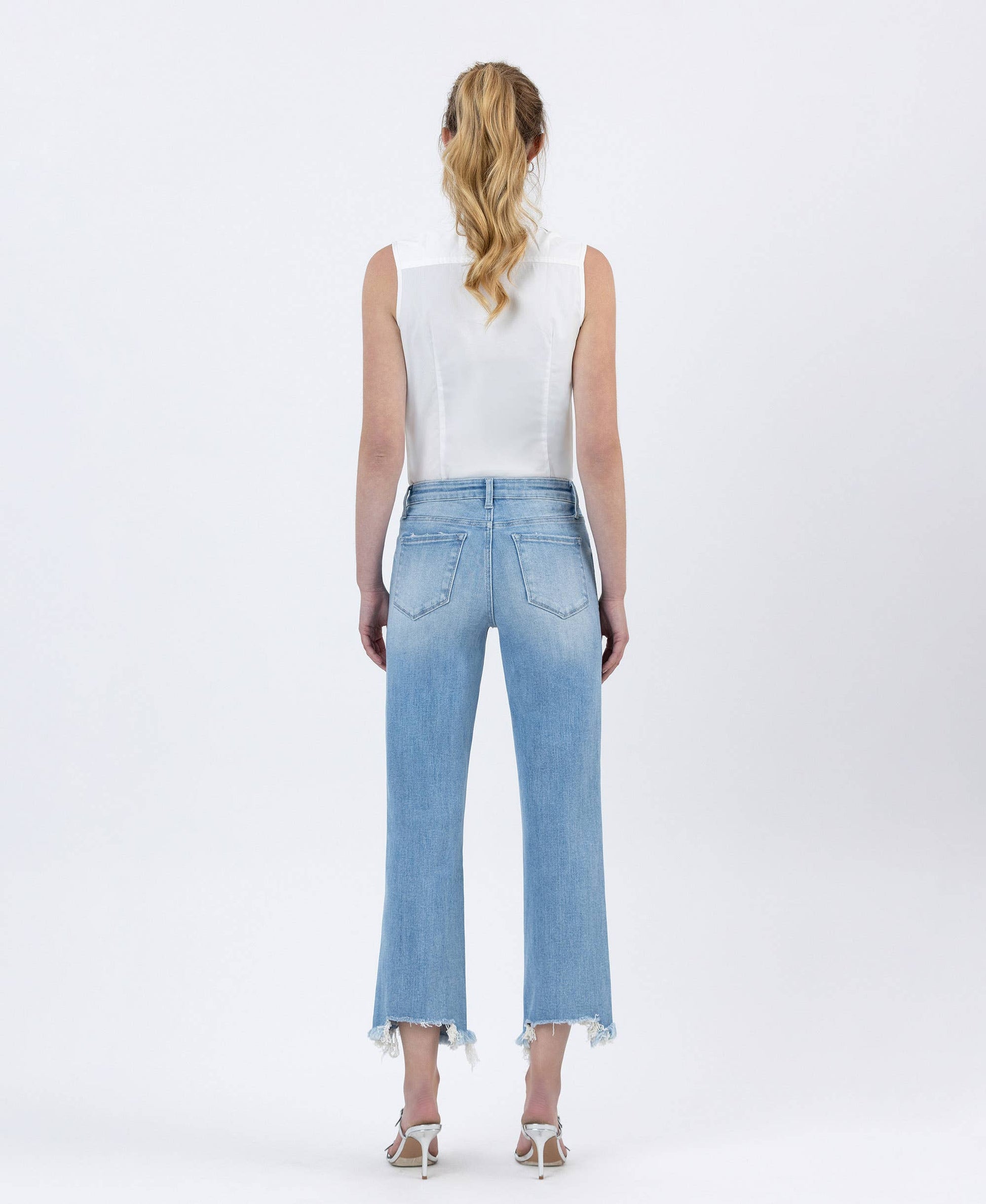 COMFORT STRETCH DENIM, HIGH RISE WAIST, DISTRESSED DETAIL, RAW HEM, CROPPED LENGTH, SLIM WIDE JEANS