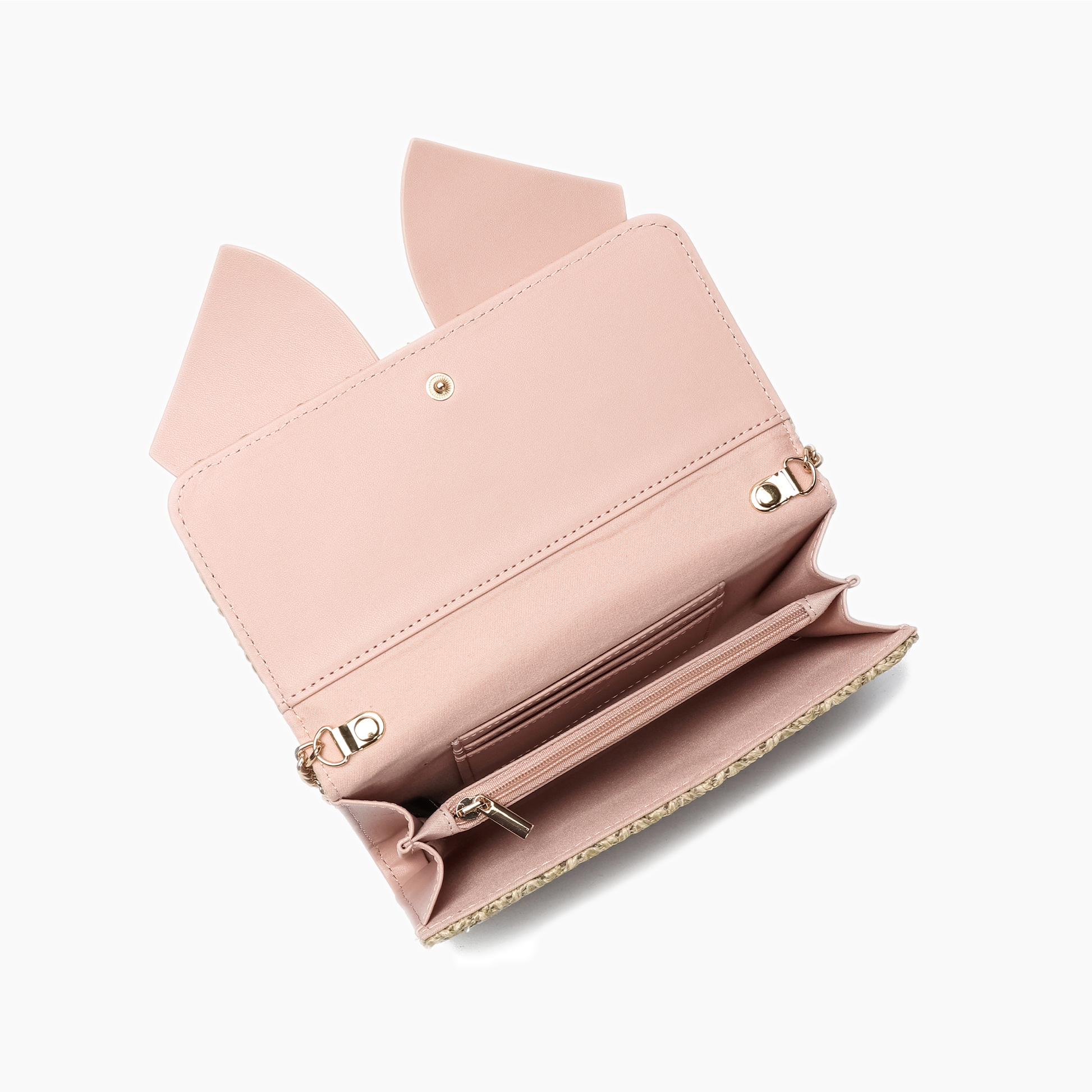 The Mini Bonnie Wallet Purse is a charming accessory designed to shine on any occasion. Crafted from a blend of straw and vegan leather, this compact crossbody brings together elegance and playfulness with its delicate bowtie detail.