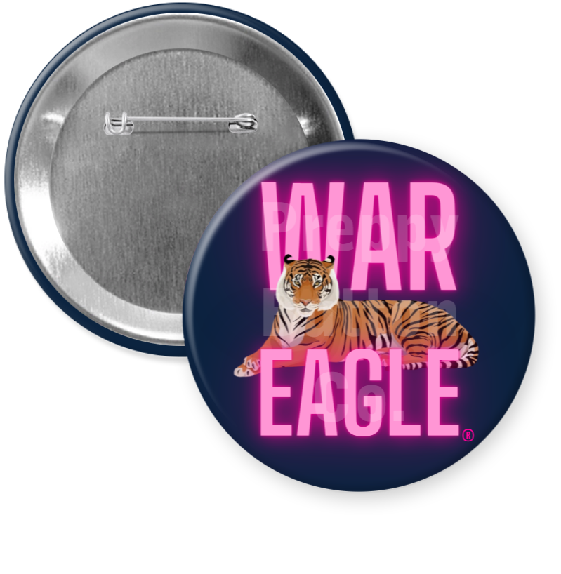 This uniquely designed gameday button is a must for showing your support of the Auburn Tigers. Featuring bright neon pink lettering, along with a majestic tiger, this button is sure to turn heads and stand out in the crowd. It is a perfect addition to any gameday attire, bag, purse, etc.
