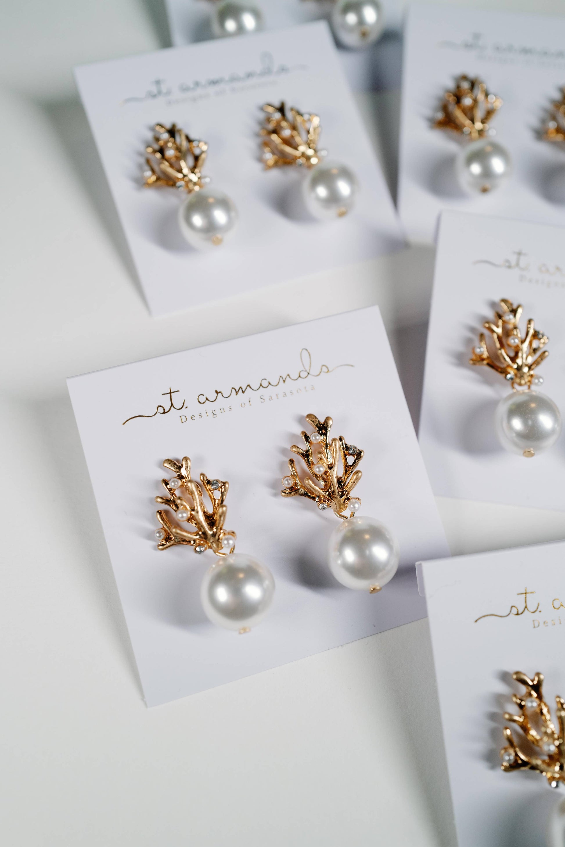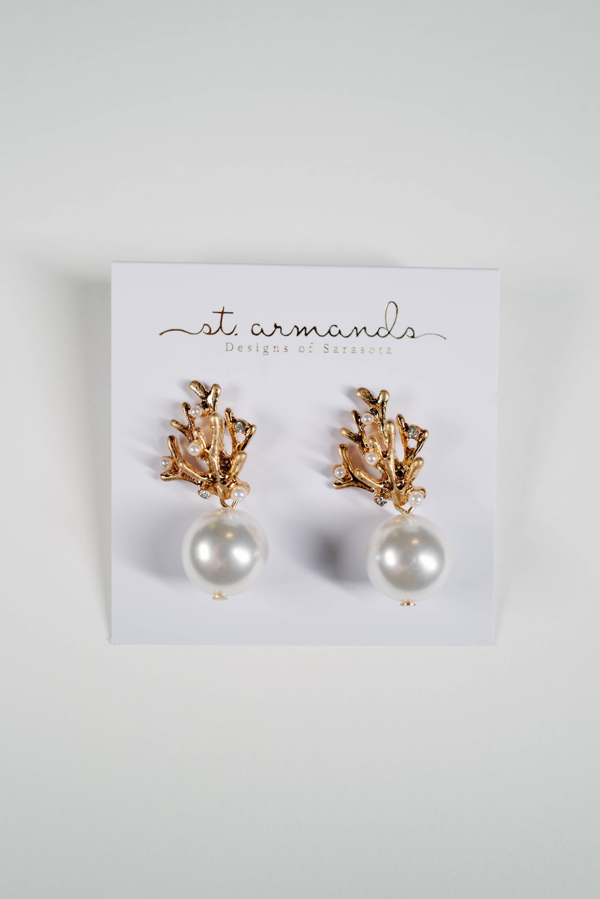 These 1" statement earrings feature a sculptural coral-inspired design in gold-plated metal, accented with delicate mini crystals and a luminous faux pearl drop. Inspired by iconic coral motifs, their organic shape and soft shimmer create an effortlessly elegant, seaside-ready look. Perfect for coastal evenings, resort wear, and elevated summer styling.