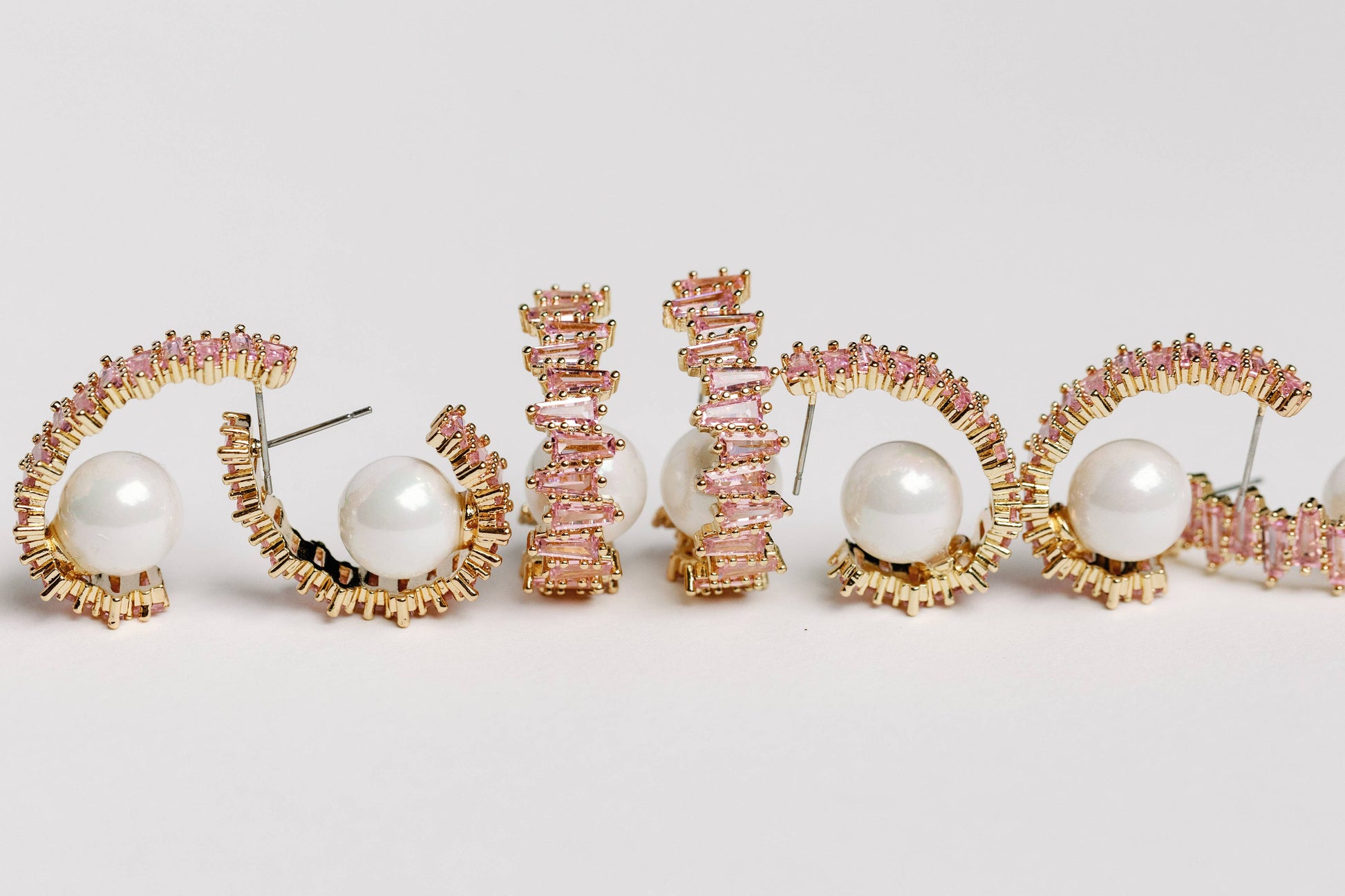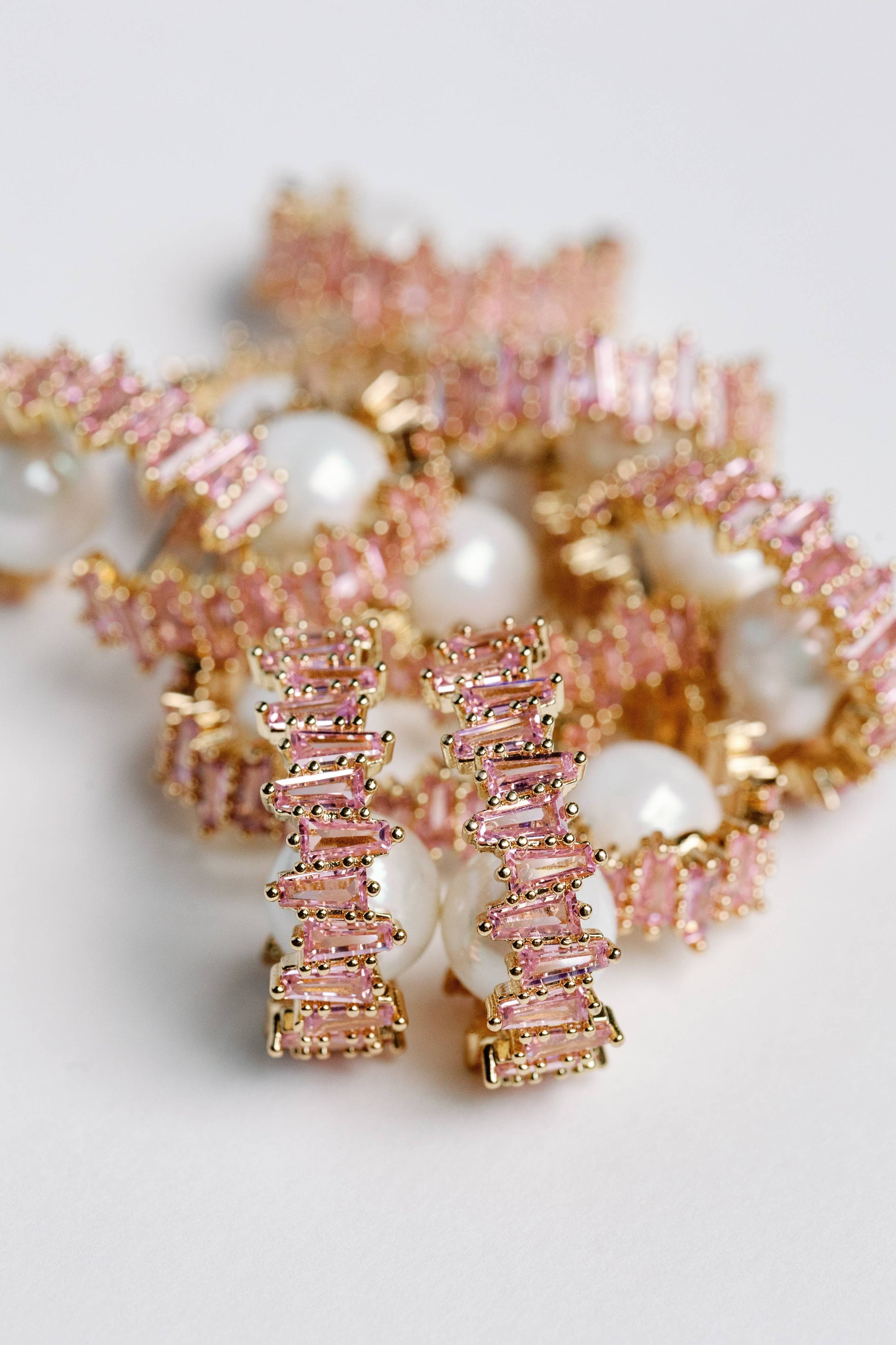 Elevate your style with these uniquely designed 1.5" hoop earrings featuring a luxe pearl nestled inside pink interlocking rhinestones. These earrings are perfect for Valentine's Day, baby showers, and anyone who loves pink.