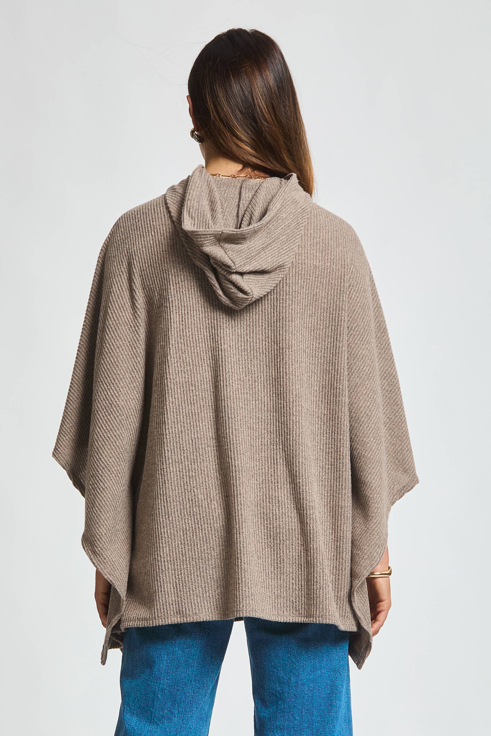 Blending the comfort of a hoodie with the relaxed elegance of a poncho, this ribbed knit top delivers the best of both worlds. The poncho style bodice drapes effortlessly for a laid back, roomy fit.