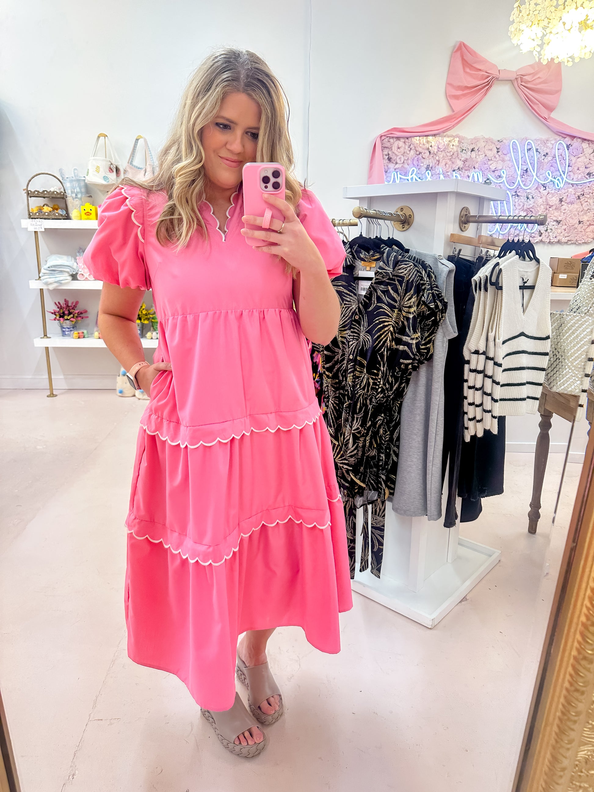 Beautiful woven pink maxi dress with scalloped detailing. Entro brand. Runs true to size.