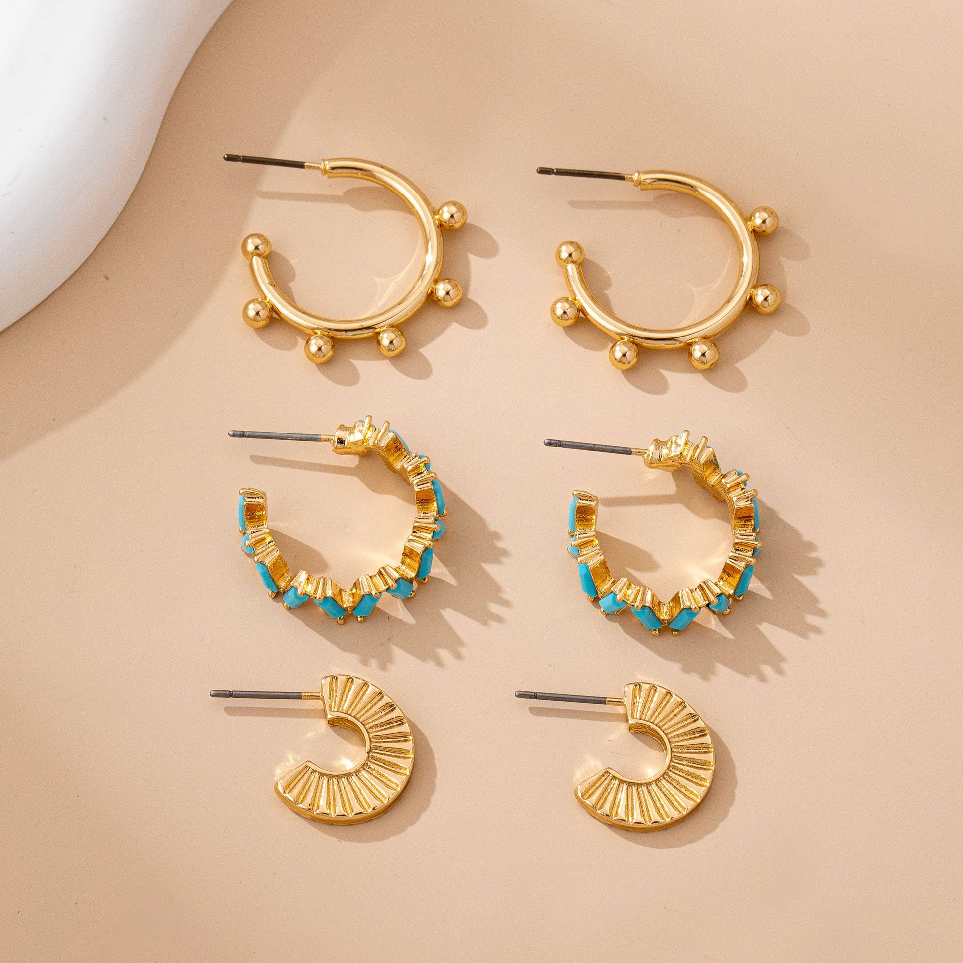 Gold-tone mix of mini hoops with turquoise enamel zigzag, textured ridges, and beaded ball details for versatile, boho-chic ear stacking.