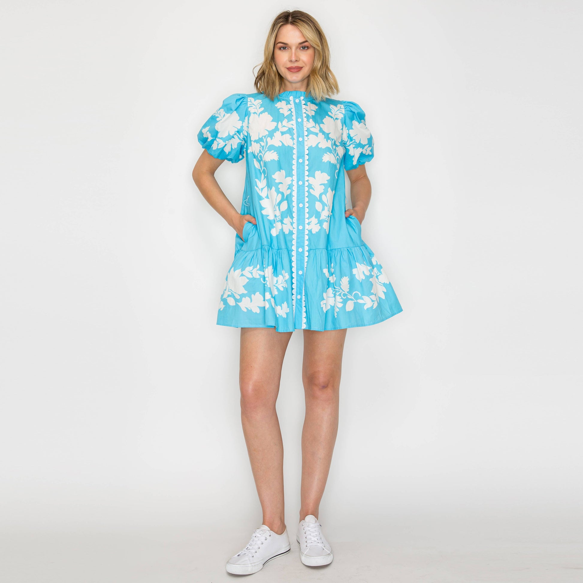 - Beautiful sky blue with white color combo leaves placement print - Cotton mini dress - Front placket with lace trim details & buttons - completely open - Drop waist design - Ruffle neck design - Bubble sleeves with elastic cuff - White buttons - Sash belt - Pockets - C.F. LENGTH - 34" SELF - 100% COTTON
